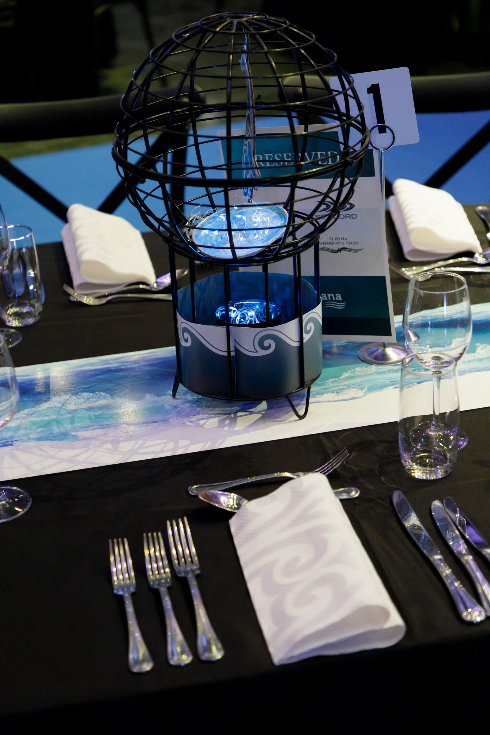 We created imagery and visual elements referencing the ocean, including the whale brand. Using custom theatre-inspired props, we created a whale diving after taking a breath as the centrepiece of the stage for both events – changing position for the second event. The lounges and florals all reflected underwater colours and textures, corals and seaweed.